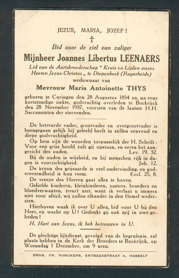Geboorteakte N° 52 / boekjaar 1854 van Jean Libert opgesteld in de Franse taal zoals het in die tijd de gewoonte was in het gemeentehuis van Kuringen. Jean Libert Leenaers eerste zoon van het gezin. Woonde nog enkel jaren op de hoeve Crutzen waar vader Gerardus en moeder Anna werken. later verhuist het gezin naar Curingen, meer bepaald achter de Demer. (Overdemer) In de Gebrandestraat nemen ze hun intrek in een klein boerderijtje. Na de tegenslagen die de familie kenden met het overlijden van twee broertjes Regniers 1859 en Louis 1870 en het jong overlijden van zijn moeder Anna op 45-jarige leeftijd in 1875 is Jean 21 jaar oud. Gerardus Leenaers is 53 jaar oud en zijn de kinderen, Chretien Casinier 19 jaar, Antoine 15 jaar, Martin 13 jaar, Marie Louise 11 jaar en Catharina Françoise 8 jaar oud. Jean werkt als knecht op een boerderij en blijft thuis wonen. Wanneer zijn vader Gerardus Leenaers overlijd 1887 op 65 jarige leeftijd , tracht hij samen met zijn oudere broers het gezin samen te houden. Een jaar later op 10 februari 1888 huwt Jean en is dan 34 jaar oud met Maria Antoinette Thijs die 22 jaar oud is te Curingen.