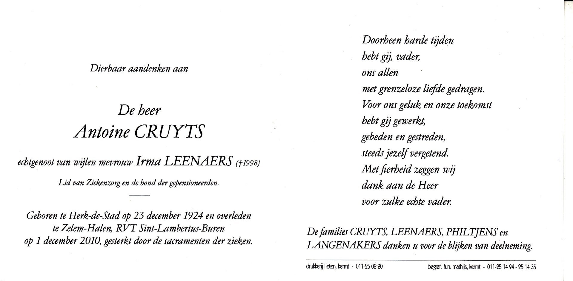 CRUYTS, Antoine, geboren op 23-12-1924 te Herk-de-Stad, overleden op 01-12-2010 te Zelem op 85-jarige leeftijd, begraven op 08-12-2010 te Tuilt-Kuringen, weduwnaar van Leenaers Irma.