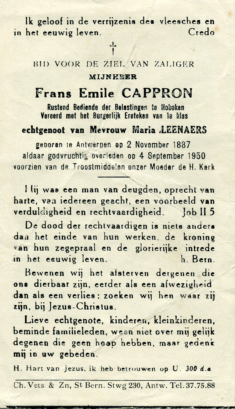 CAPPRON Frans Emile, geboren op 2-11-1887 te Antwerpen, overleden 4-09-1950 te Antwerpen, Echtgenoot van Maria Leenaers. Bron Bidprentje