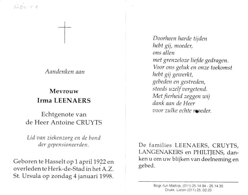 LEENAERS, Irma, geboren op 01-04-1922 te Hasselt, overleden op 04-01-1998 te Herk-de-Stad op 75-jarige leeftijd, begraven op 08-01-1998 te Tuilt-Kuringen, echtgenote van Cruyts Antoine.