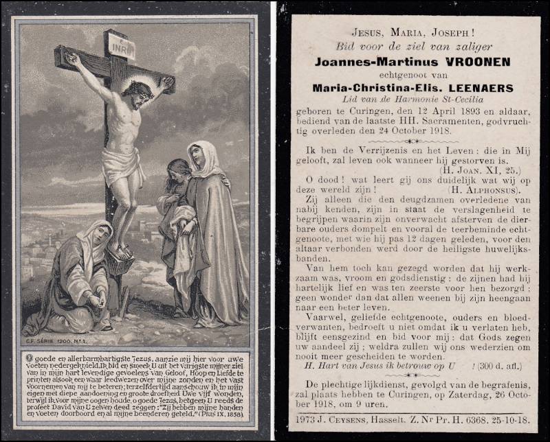 VROONEN, Joannes Martinus, geboren op 12-04-1893 te Kuringen, overleden op 24-10-1918 te Kuringen, begraven op 26-10-1918 te Kuringen, echtgenoot van Maria Christina Elisa Leenaers (Bron Bidprentje)