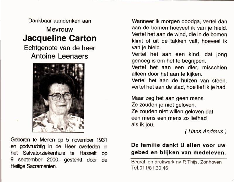 CARTON, Jacqueline, geboren op 05-11-1931 te Menen, overleden op 09-09-2000 te Hasselt Salvator Ziekenhuis op 68-jarige leeftijd, begraven op 14-09-2000 te Bolderberg, echtgenote van Leenaers Antoine.