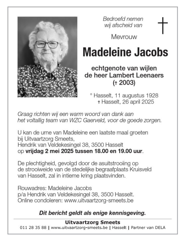 JACOBS Madeleine, geboren op 11-08-1928 te Hasselt, overleden op 26-04-2025 te Hasselt op 96-jarige leeftijd, gecremeerd op 2-05-2026 te Hasselt "de Tesch",