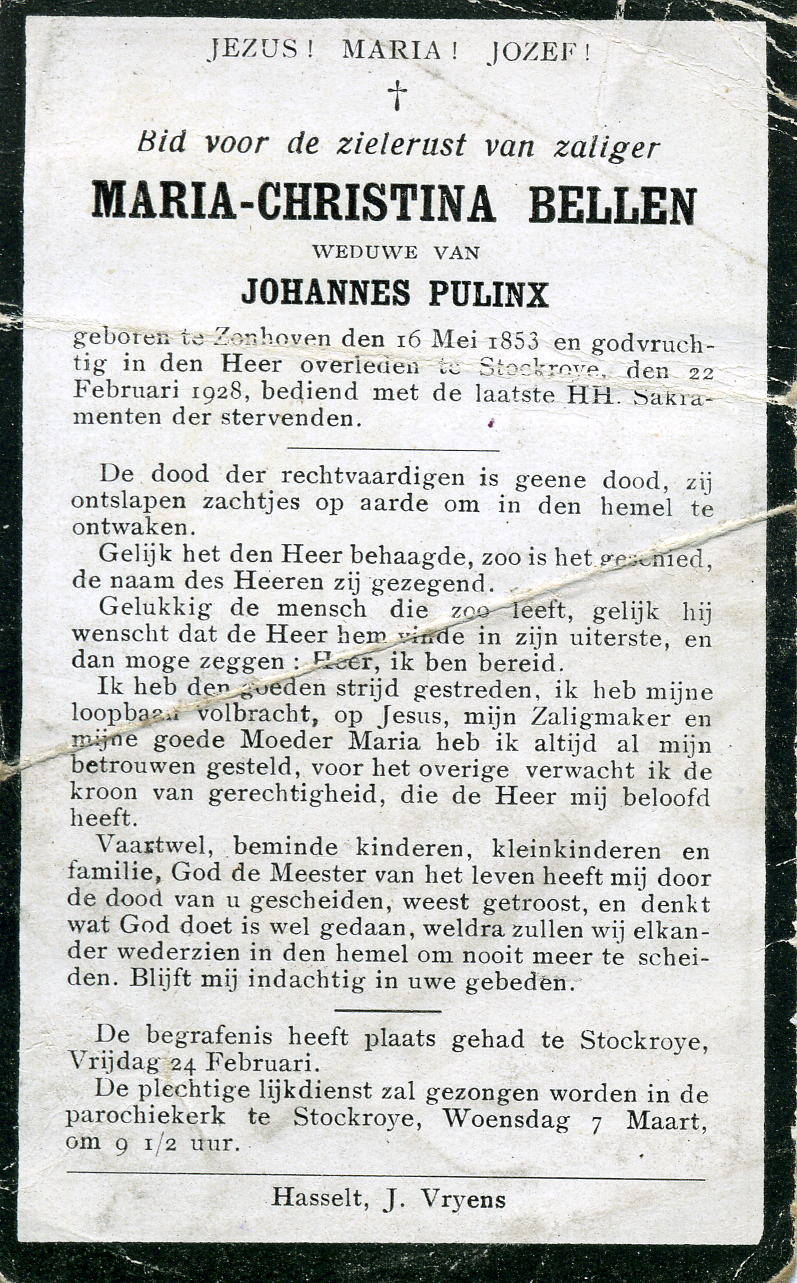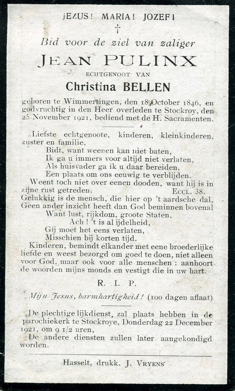 Pulinx Joan, smid, hoefsmid geboren op 18-10-1846 te Wimmertingen, overleden op 25-11-1921 te Stokrooie op 75-jarige leeftijd.